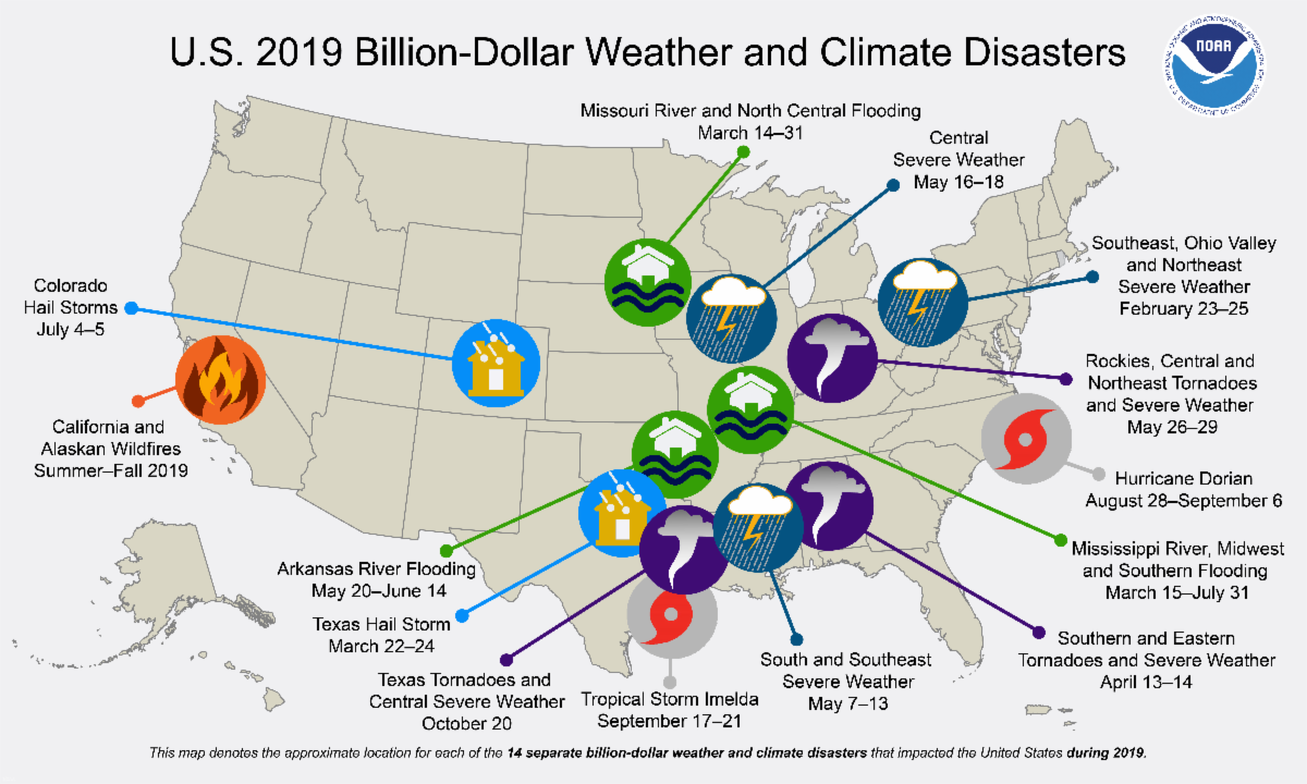 Texas suffered three of the 14 billion-dollar weather and climate disasters across the United States in 2019, according to a new report by the National Oceanic and Atmospheric Administration (NOAA).
