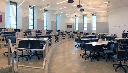 The ALC will have student spaces and instructional areas spread between both floors. The instructional spaces will include two “parliament-style” active lecture halls, four learning studios and a flat-floor and tiered collaboration classroom. All classrooms will support protected Wi-Fi connections and provide easy access to projection equipment. The building’s layout also includes triage rooms to provide faculty prep and post-class breakout spaces.