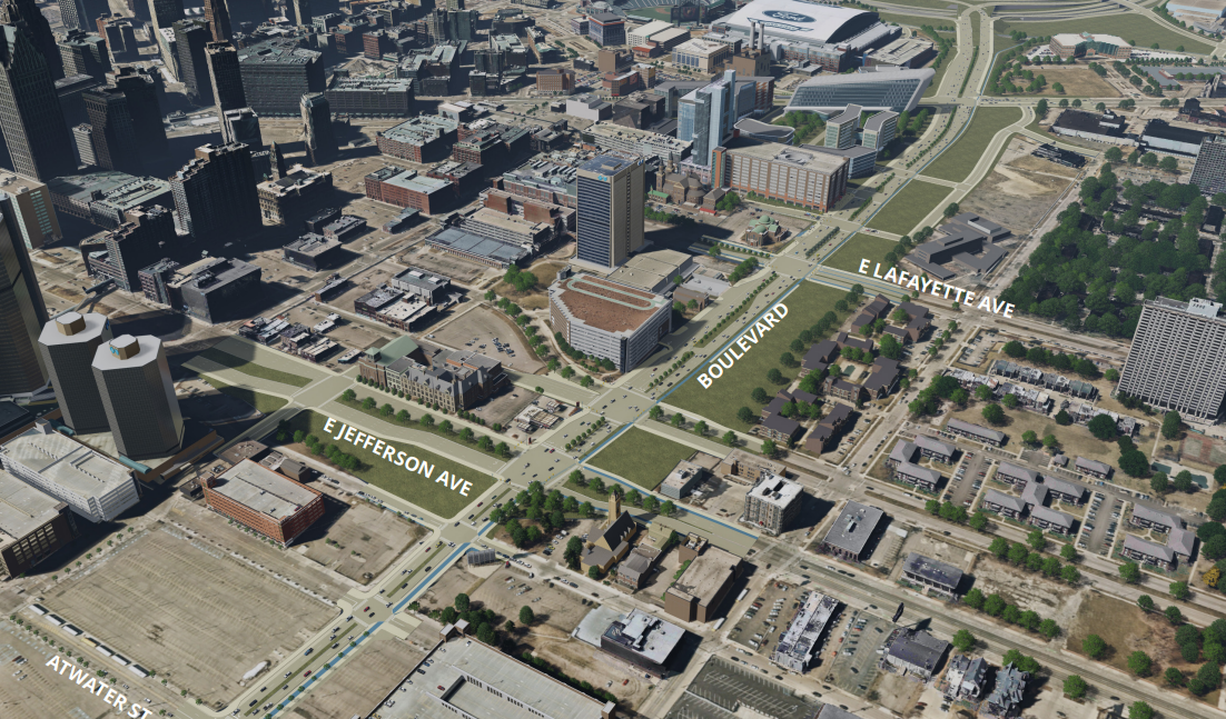 Improved nonmotorized facilities include a two-way cycle track on the east side of the boulevard connecting the riverfront to the Montcalm Street extension. The cycle track will extend west to Brush Street and east to Gratiot Avenue, where it will connect with the Dequindre Cut bicycle path.