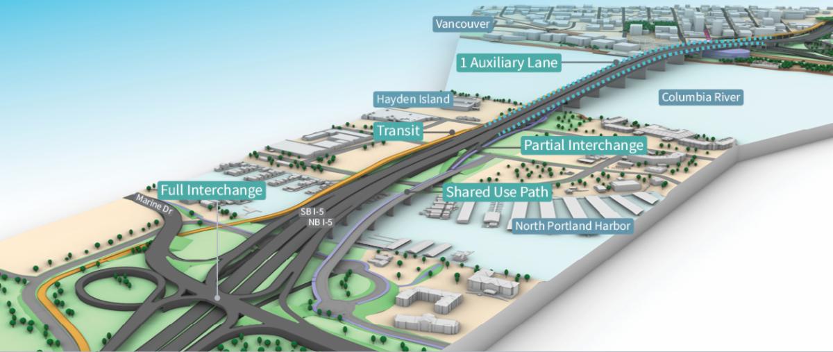 Construction of a partial interchange at Hayden Island and a full interchange at Marine Drive is designed to minimize impacts while making improvements to freight and workforce traffic and active transportation on Hayden Island and Marine Drive.